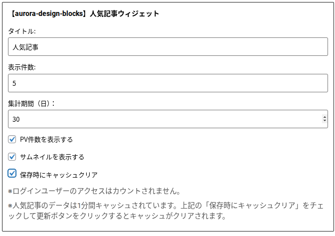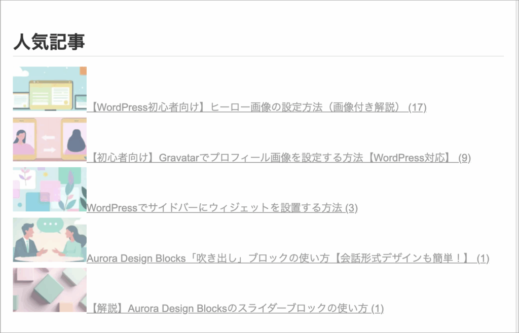 そんな時に便利なのが、Aurora Design Blocksの人気記事ウィジェットです。アクセス数の多い順に記事をランキング表示します。