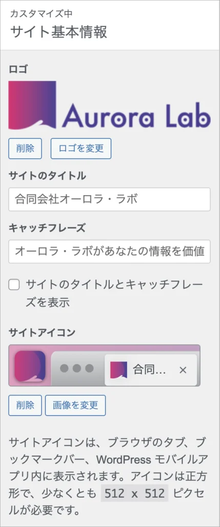 サイトのタイトルとキャッチフレーズを表示にチェックを入れるとロゴの代わりにキャッチフレーズが表示されます。