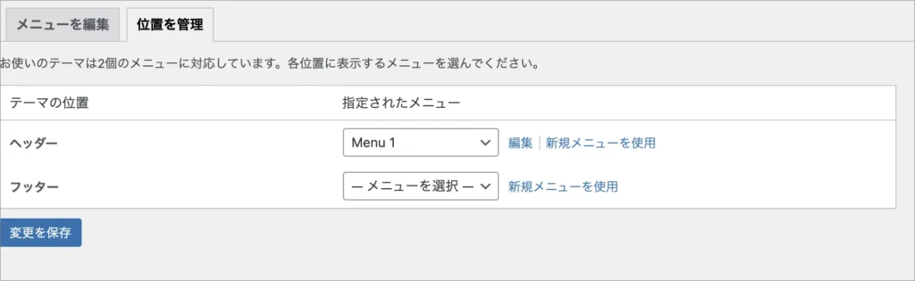 2. 「位置を管理」タブを選択し、「フッター」の「新規メニューを使用」をクリック