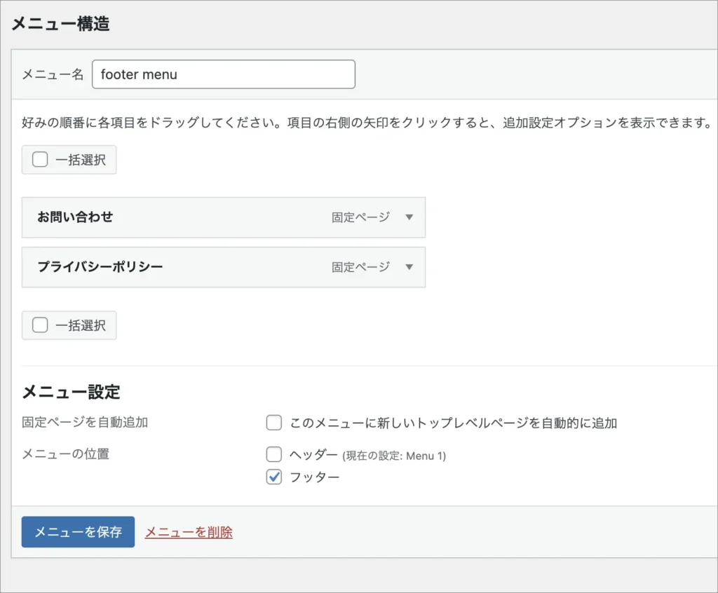 1. 「メニュー設定」内の「フッター」にチェックが入っているか確認