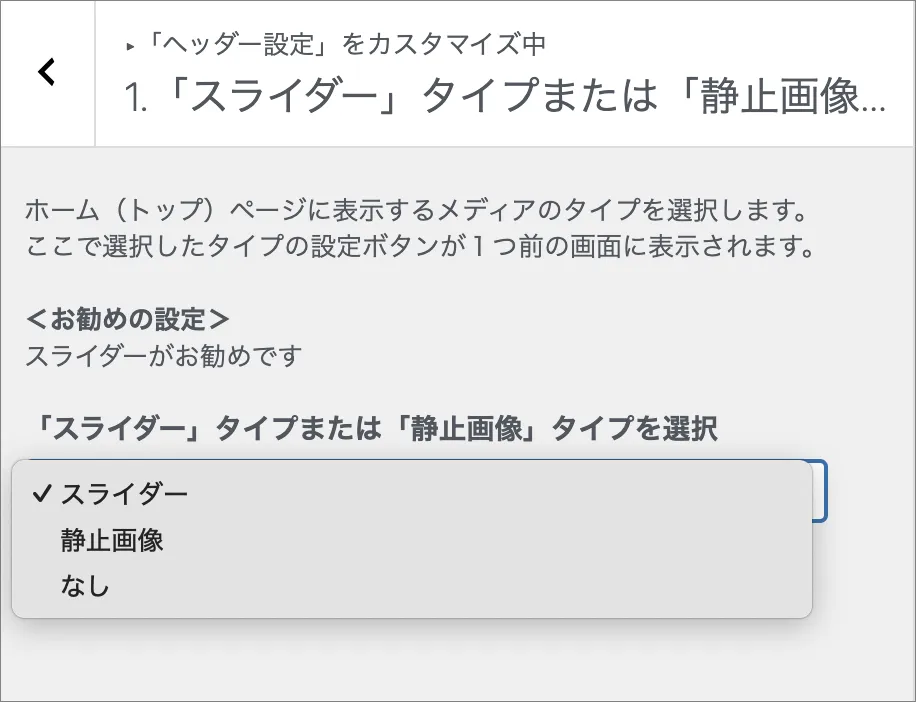 [fontawesome icon=fa-clipboard-check] スライダーまたは静止画像または、なしを選択します。