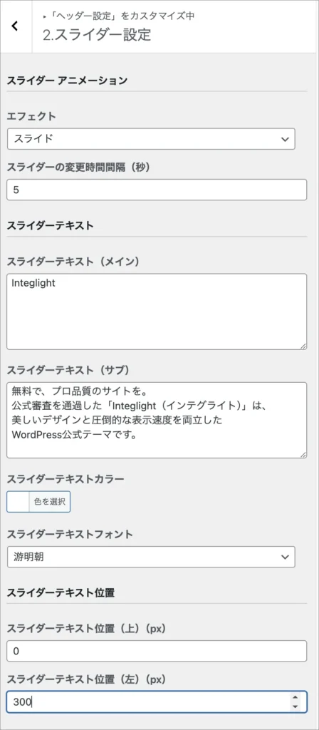 \n\n—\n\n## 【Iinteglight】ヘッダー設定|スライダー設定|スライダー設定の手順\n\n