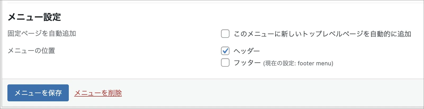 1. 「メニュー設定」内の「フッター」にチェックが入っているか確認