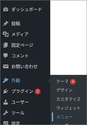 WordPressのダッシュボード左にある「ダッシュボード > 更新」に、数字付きの赤いバッジが表示されていたら、テーマやプラグインの更新が利用可能です👇